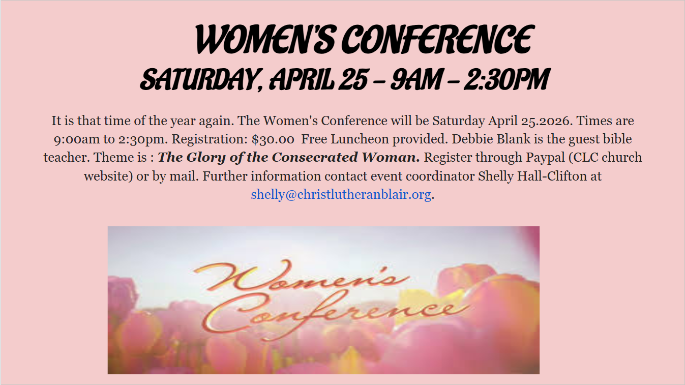 Women's Conference will be Saturday, April 25, 2026. Times are 9:00 AM - 2:30 AM. Registration: $30.00. Free Luncheon provided. Debbie Blank is the guest bible teacher. The theme is The Glory of the Consecrated Woman.